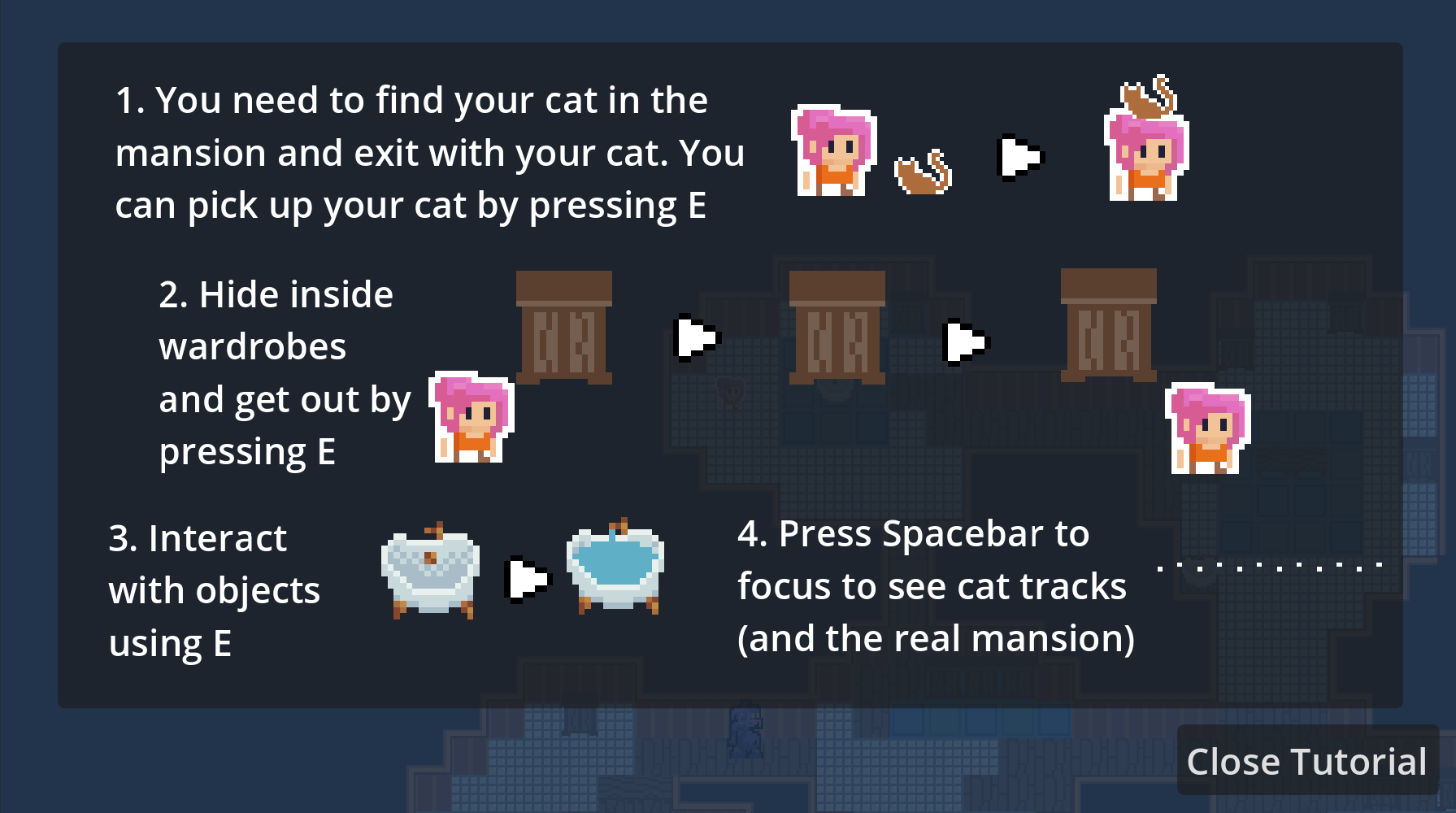 Look for your cat in the mansion and exit together in one piece. Pick up your cat after finding it by pressing E.